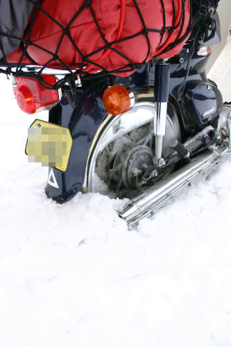 リアフェンダーが雪に乗り、タイヤが浮いて完全に駆動力を失う。